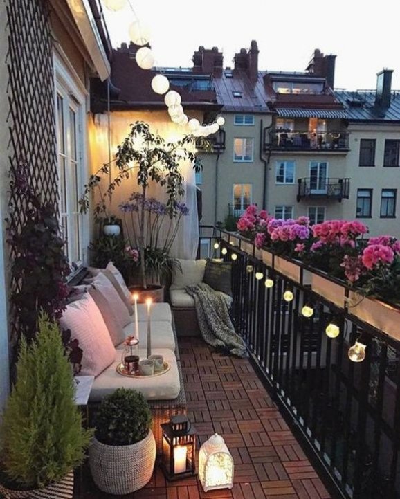 Osvětlení balkonu jednoduše: žárovky na zábradlí a světelný řetěz nad hlavou